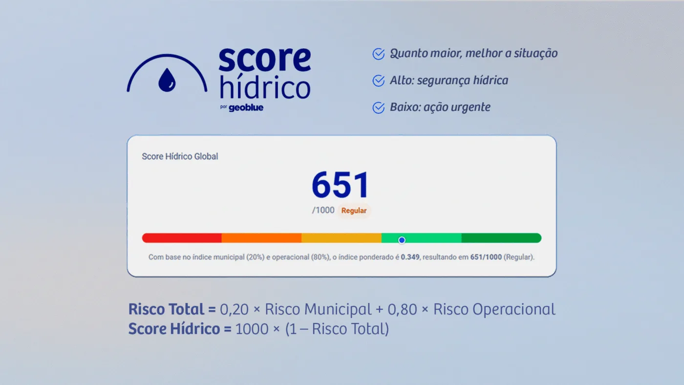 Desenvolvido pela Geoblue, o Score Hídrico transforma dados complexos sobre disponibilidade e gestão de água em um número objetivo: um termômetro da vulnerabilidade hídrica de indústrias, condomínios, hospitais e fazendas.