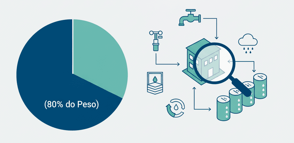 Risco Operacional (80% do Peso): A maior parte do seu score depende do que você pode controlar. Avaliamos suas práticas internas, desde a diversidade de fontes até a autonomia dos seus reservatórios.